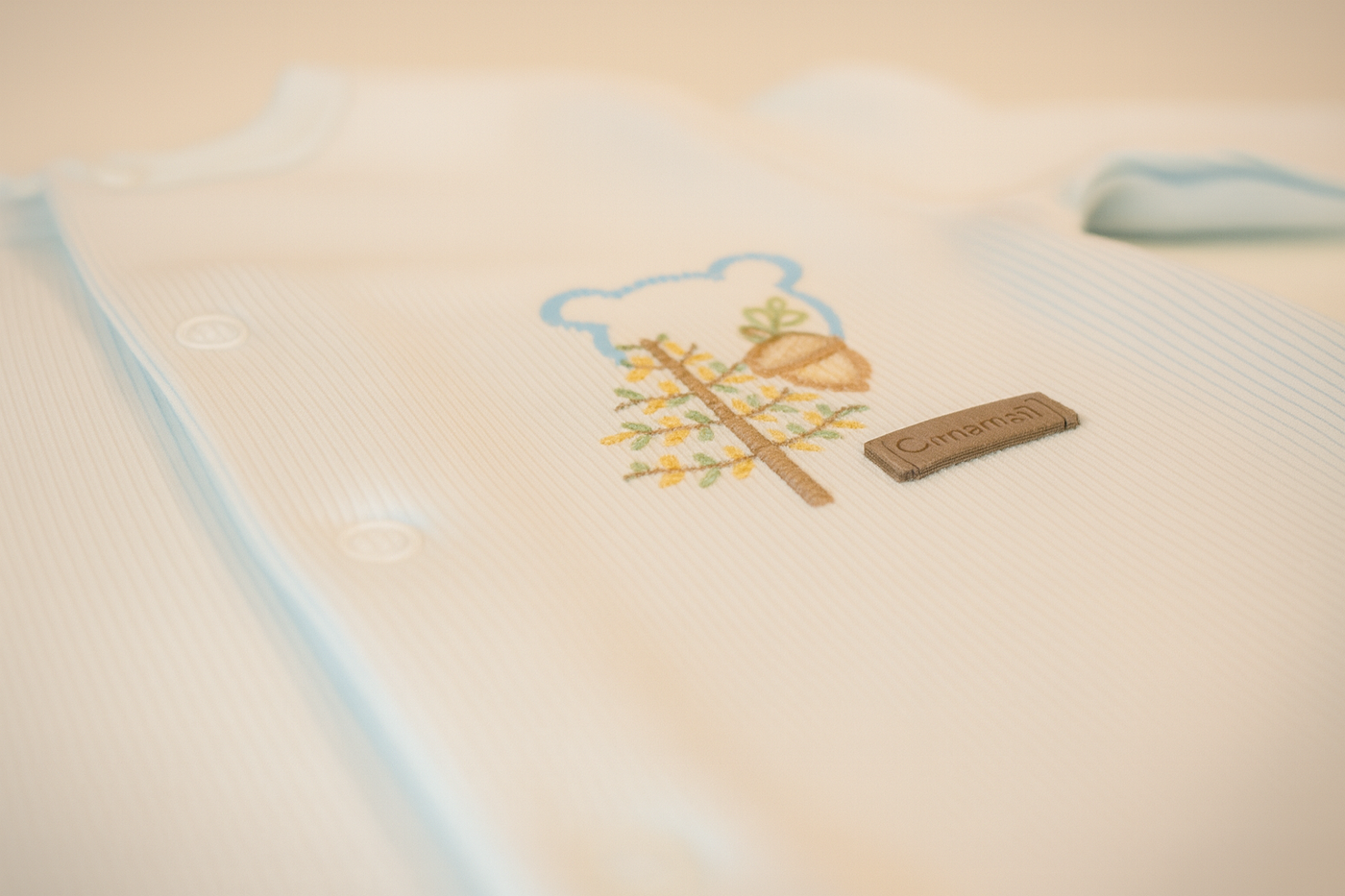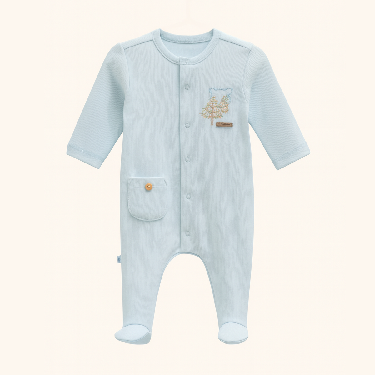 Uitgevoerd in een zachte babyblauwe tint met een liefdevol geborduurd motief van een boompje, eikeltje en beertje, brengt dit pakje een subtiel vleugje herfst in de babycollectie.